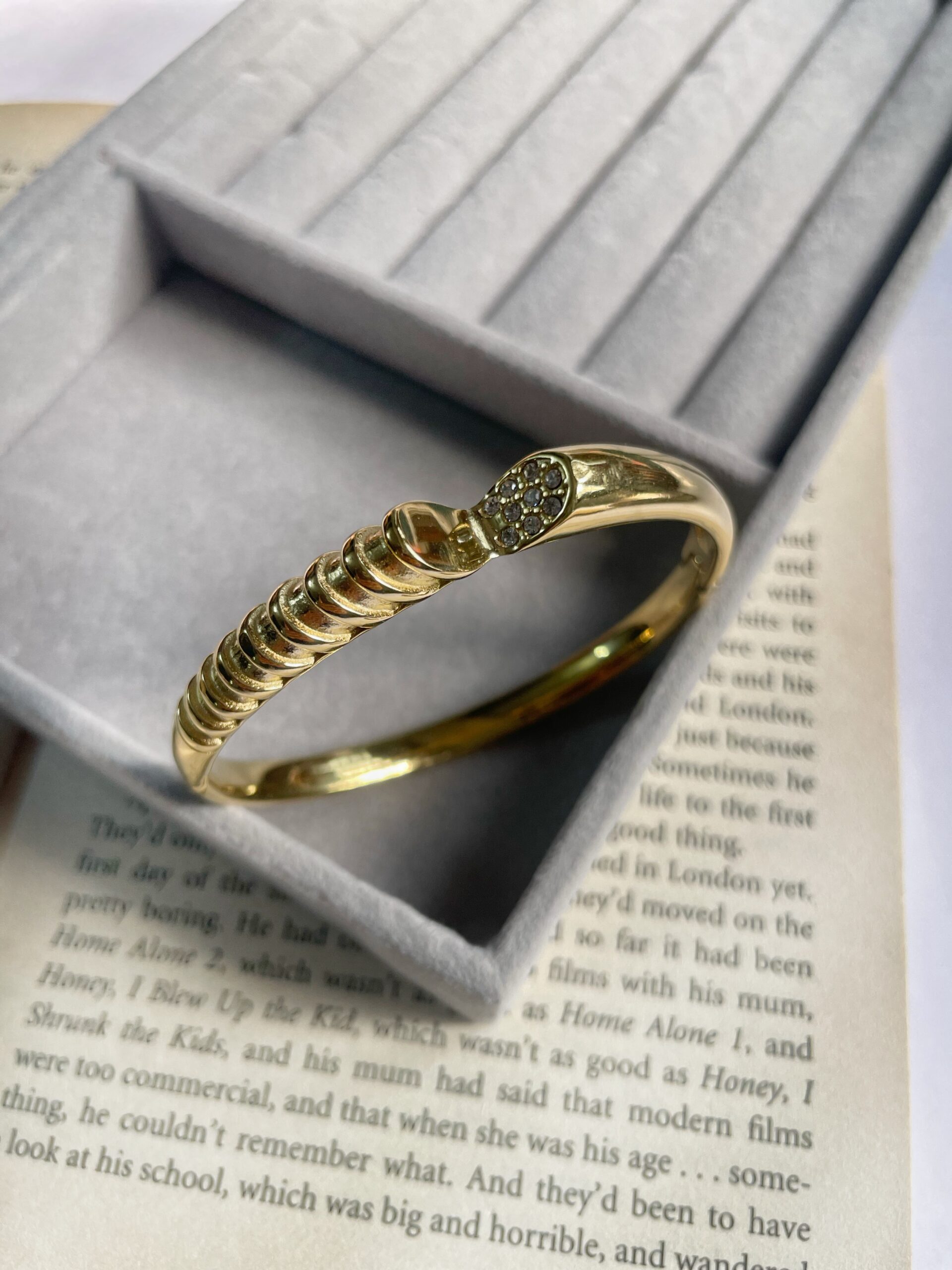 Croissant Chic showcases a beautifully crafted golden band, with a delicate croissant-inspired segmentation on one side and a sleek plain side, framing an open book-shaped center with sparkling stony fillings.