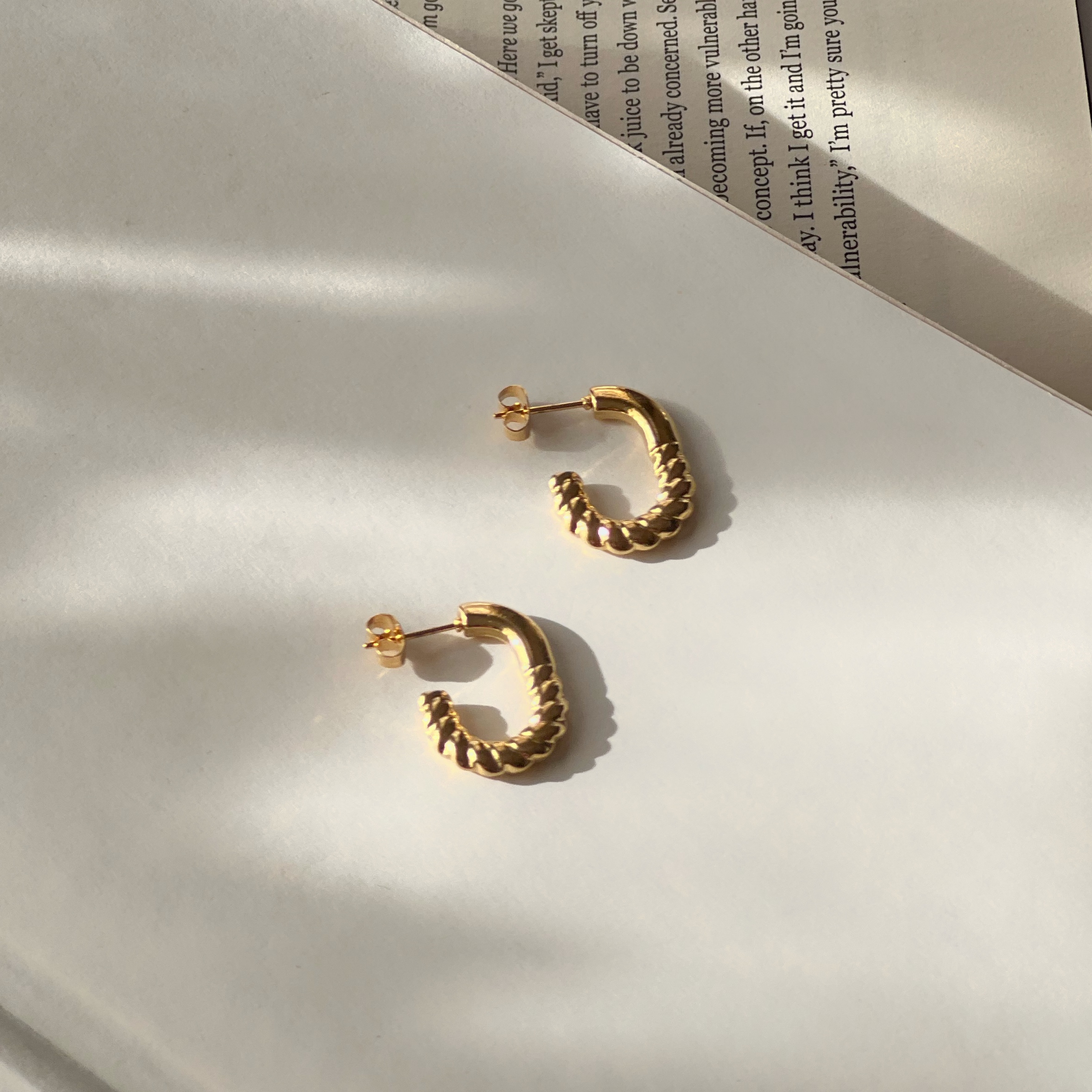 A pair of earrings combining golden lines with iconic curves of a croissant