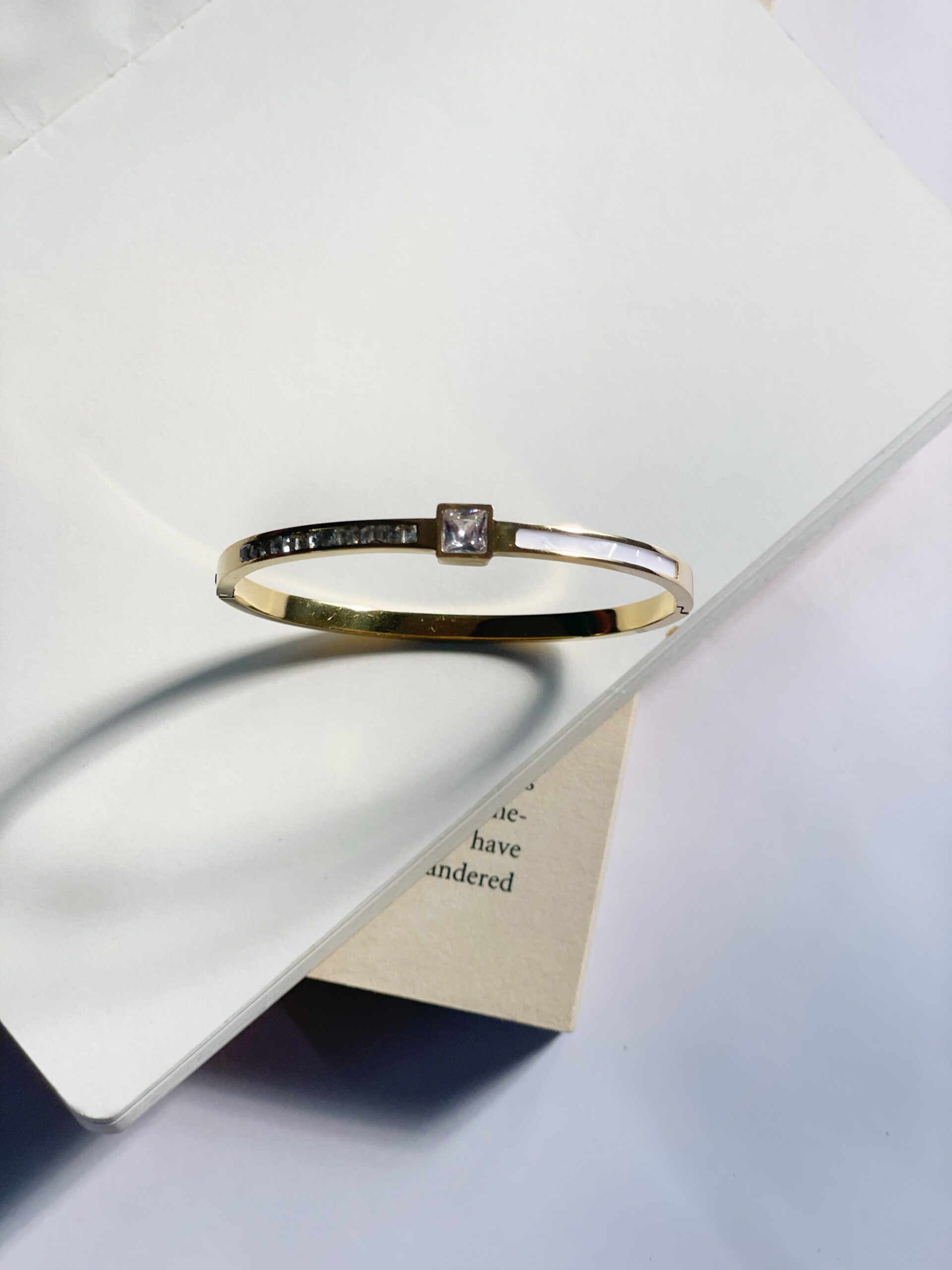 The Ivory Embellish cuff features a striking square-shaped center stone, flanked by an array of stones on one side and an elegant white design on the other, creating a beautiful contrast.