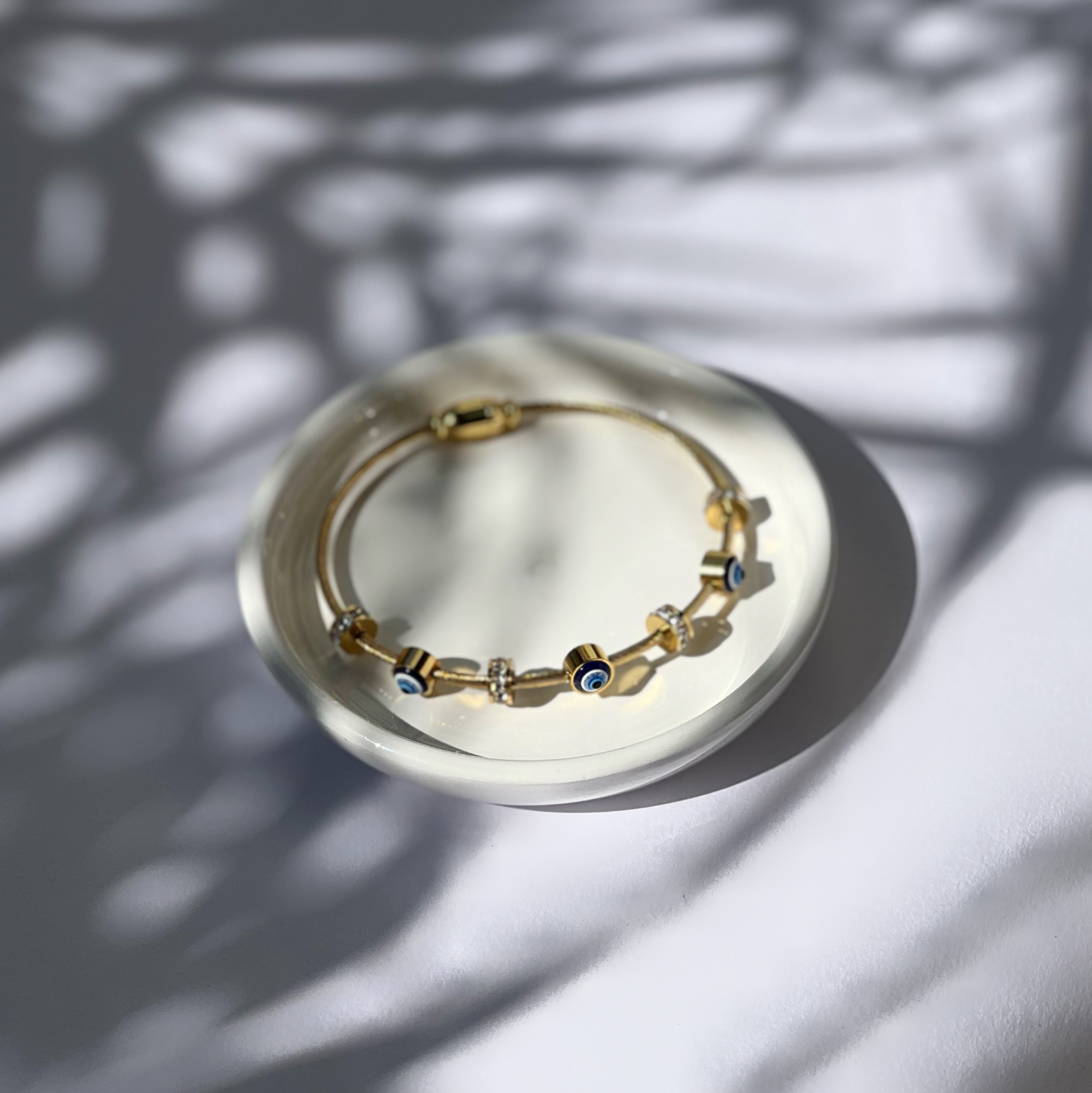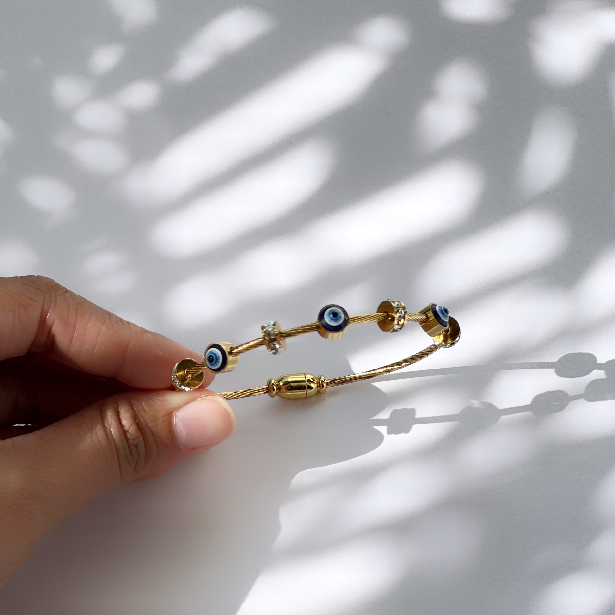 Embellished with three bold evil eyes, the Malocchio cuff bracelet offers a striking blend of protection and style