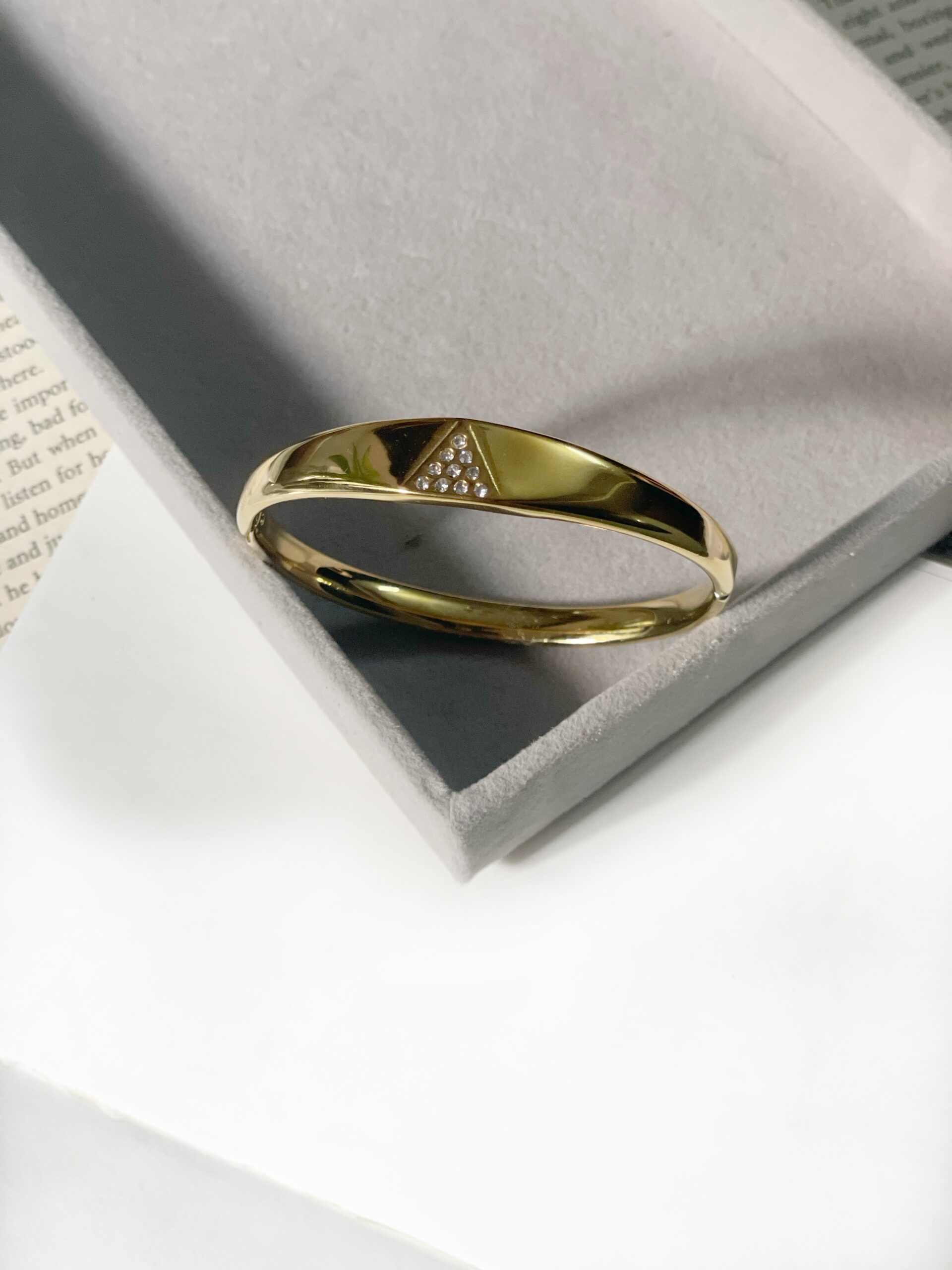 Minimalist with a hint of mystery, The Prism Whisper Cuff features a sleek golden band crowned with a delicate triangle of shimmering stones — a quiet nod to clarity, focus, and inner strength.