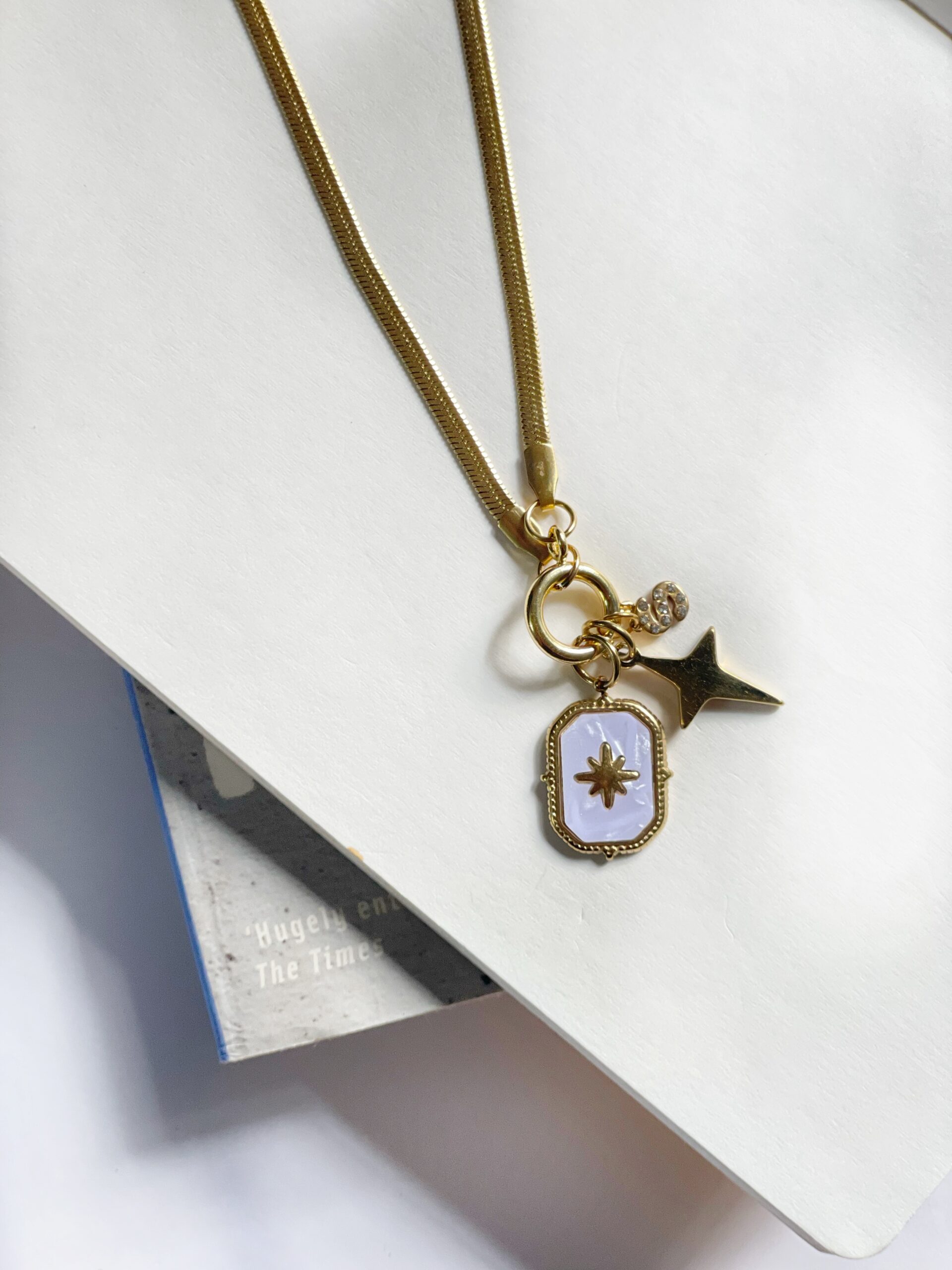 Make a wish with our Starlit Whispers necklace, featuring a sleek snake chain and a hollow circular pendant from which three celestial charms are suspended: a golden star-studded locket, a whimsical wishing star with a trailing tail, and an S-shaped locket adorned with sparkling stones, capturing the magic of dreams and desires.