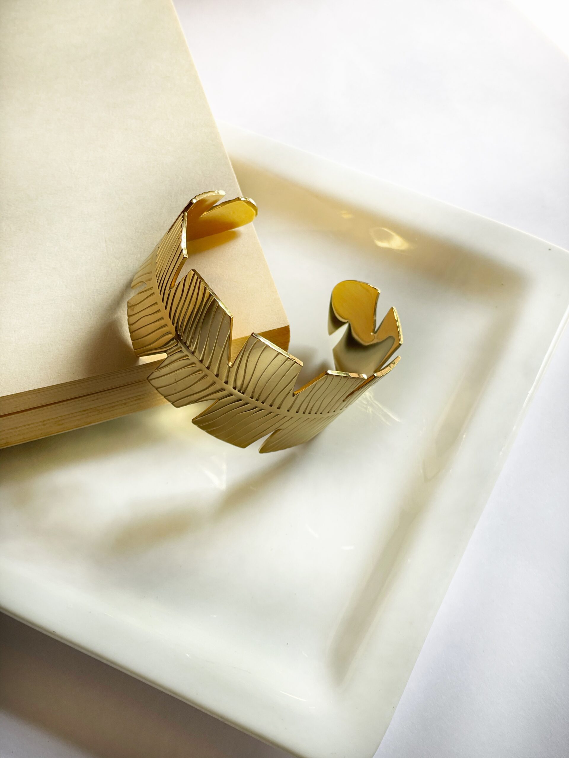 Add a touch of tropical glamour to your look with our Tropical Twist cuff bracelet, featuring a unique curved design and intricate cuttings that resemble the delicate veins of a leaflet.
