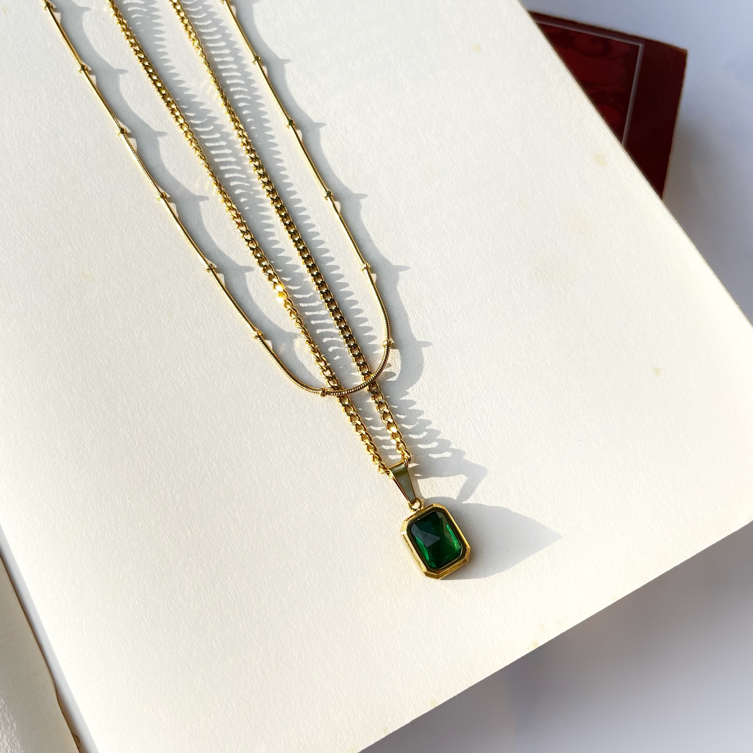 An exquisite pendant featuring a vibrant green emerald, carefully set in a refined gold frame. This necklace combines sophistication with a touch of color, perfect for adding a luxurious and timeless accent to any ensemble